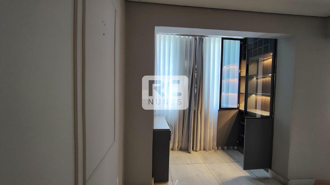 Apartamento diferenciado, com sala ampla para dois ambientes, piso em porcelanato, painéis decorativos, adega, cristaleira e cortina. A varanda integrada amplia o espaço social e traz aconchego.