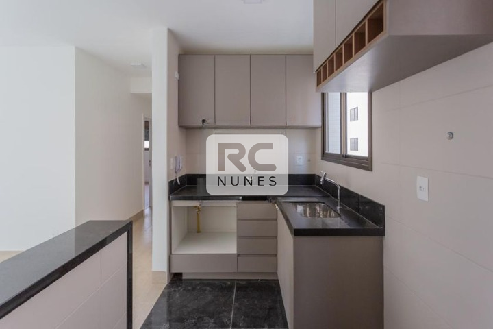 A cozinha estilo americana possui piso em porcelanato, bancada em granito e armários, integrando-se de forma harmoniosa à área social. Conta ainda com área de serviço.