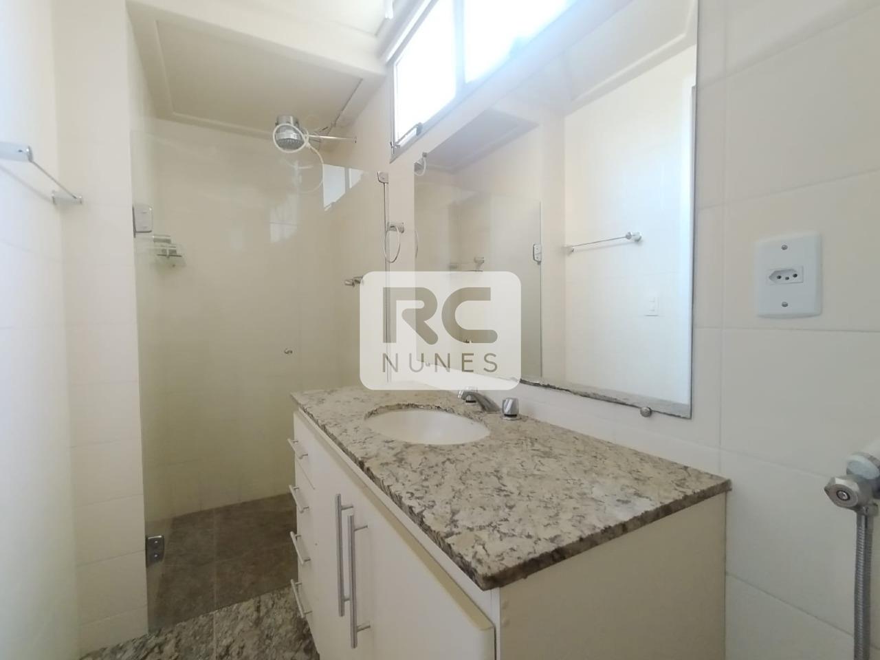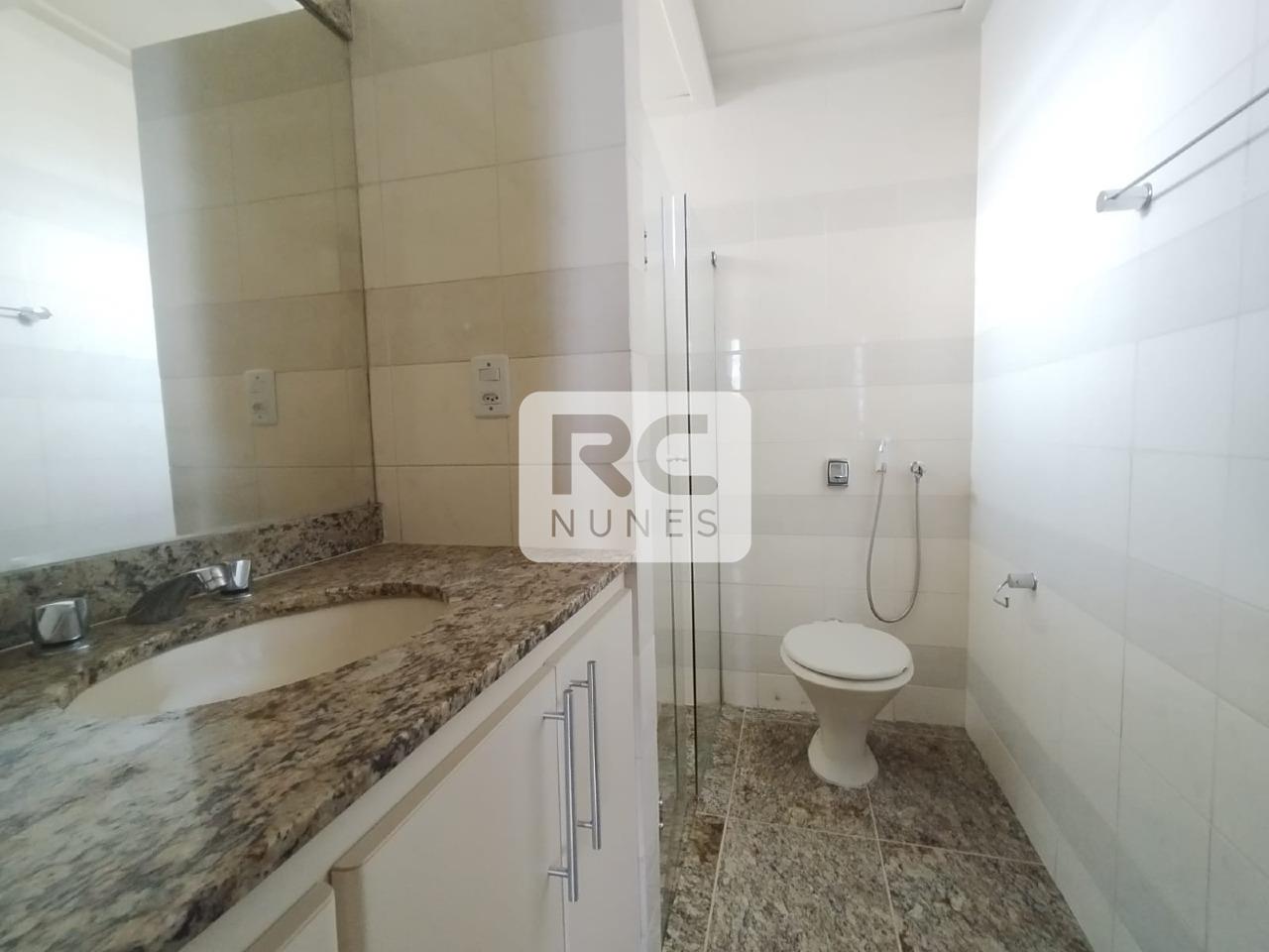 Banheiro social e suite com piso e bancada em granito e armários.