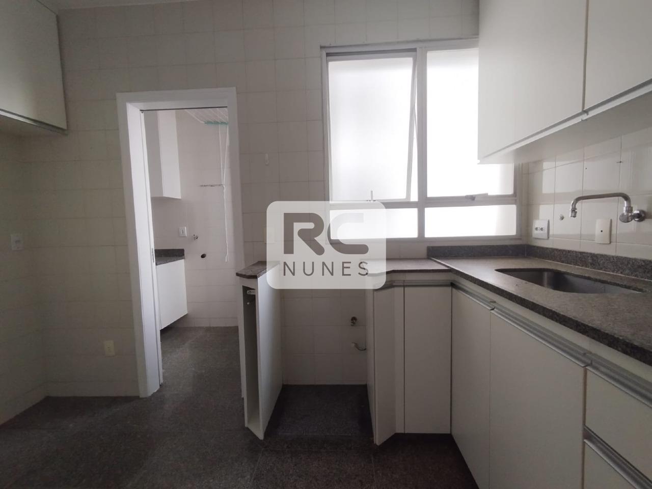 Cozinha com piso e bancada em granito, toda equipada com ármarios.