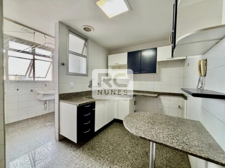 Cozinha com piso em e bancada em granito, área de serviço e banheiro.