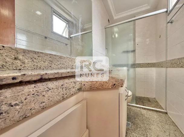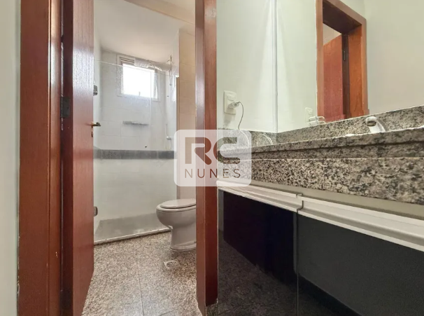 Banheiros suíte e social com piso e bancada em granito, armários e box.