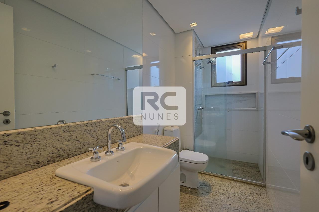 Banheiros suítes com piso em porcelanato, bancada em granito, armários e box.