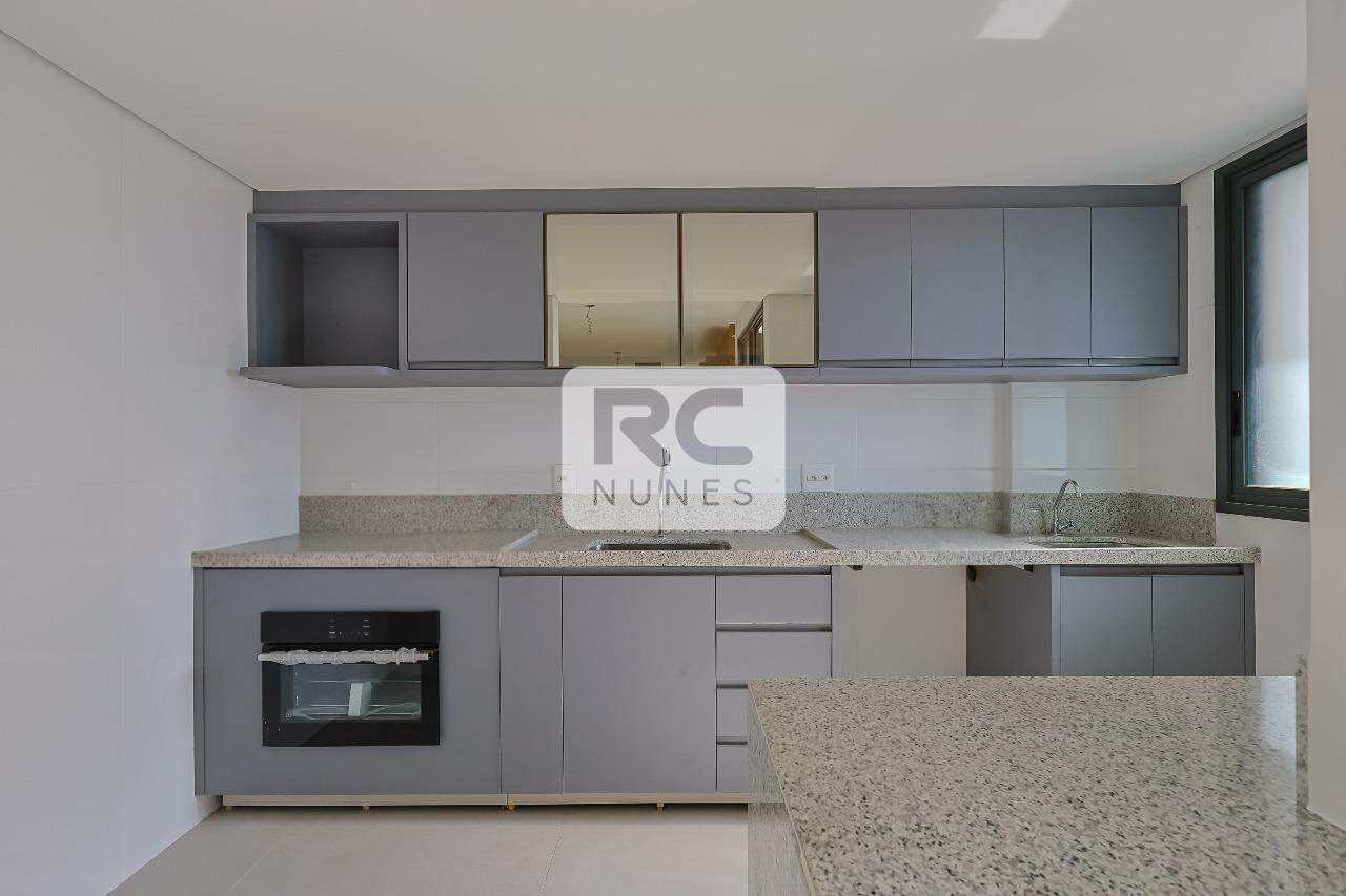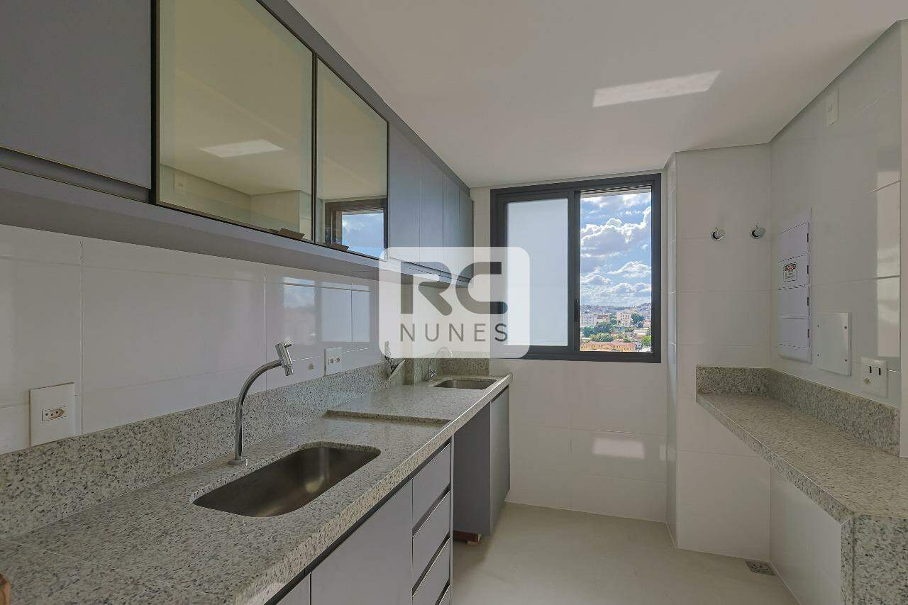 Cozinha com piso em porcelanato e bancada em granito, área de serviço.
