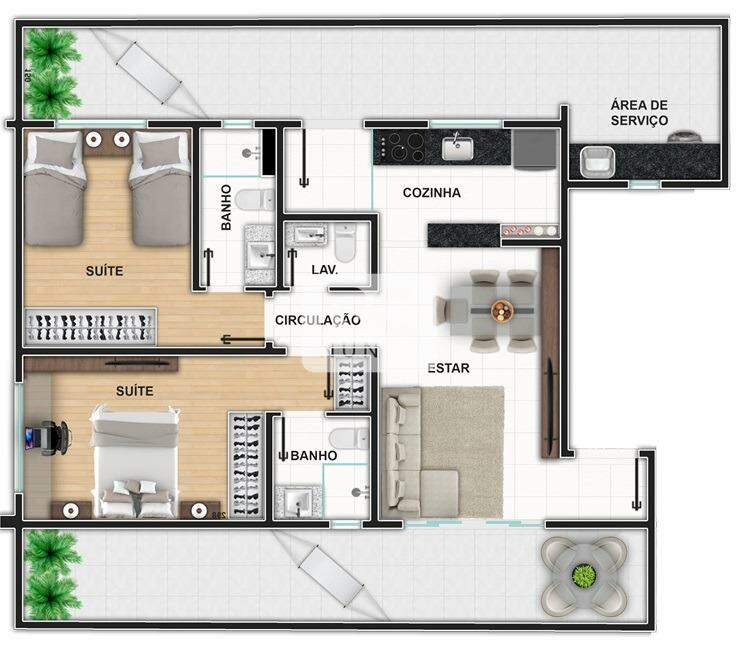 A sala é integrada com a cozinha. O apartamento conta ainda com 40 m² em 2 áreas privativas. Os quartos têm acabamento com porcelanato Portobello e piso vinílico.