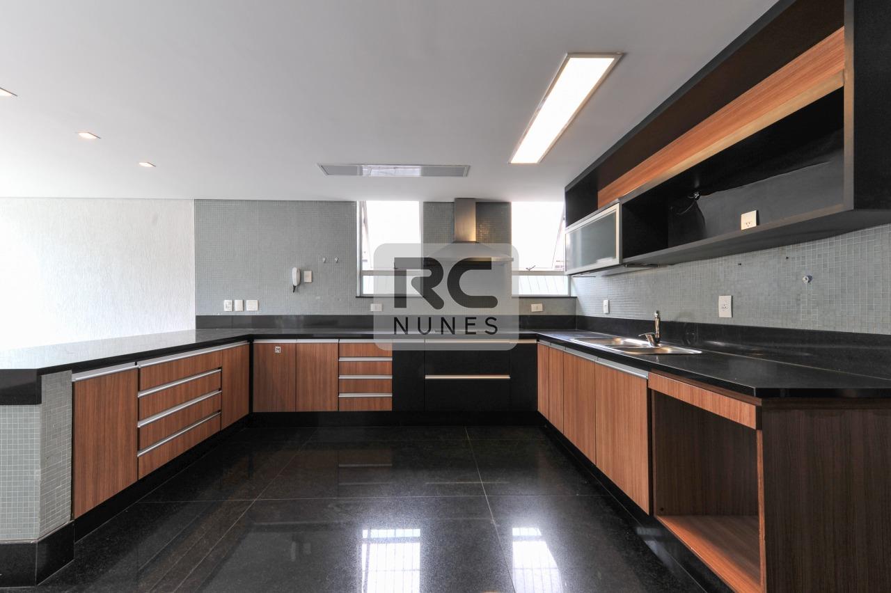 - Cozinha planejada com armários e coifa,