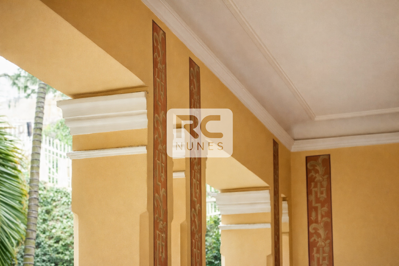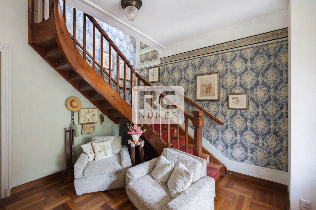 A casa possui salas de visita, jantar e escritório. Halls de entrada e de comunicação entres os ambientes.