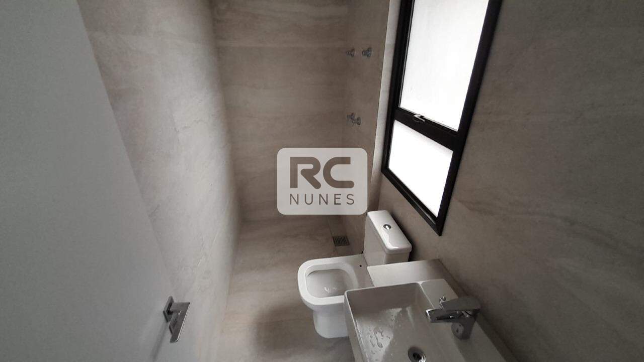 Banheiros, suítes e social com piso em porcelanato e bancada em granito.