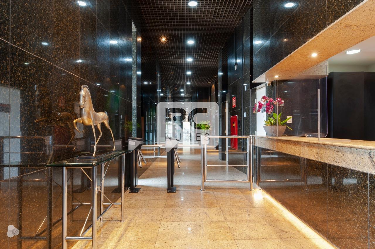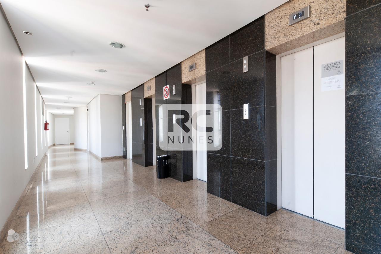 Prédio comercial imponente, de esquina, alto luxo, revestido em granito preto, terreno com área de 1.833m² com lojas na parte debaixo. Possui 15 andares com 10 salas por andar, 03 elevadores, auditório, hall social decorado, portaria 24hs, controle de acesso com catracas, câmeras de segurança e estacionamento rotativo.
