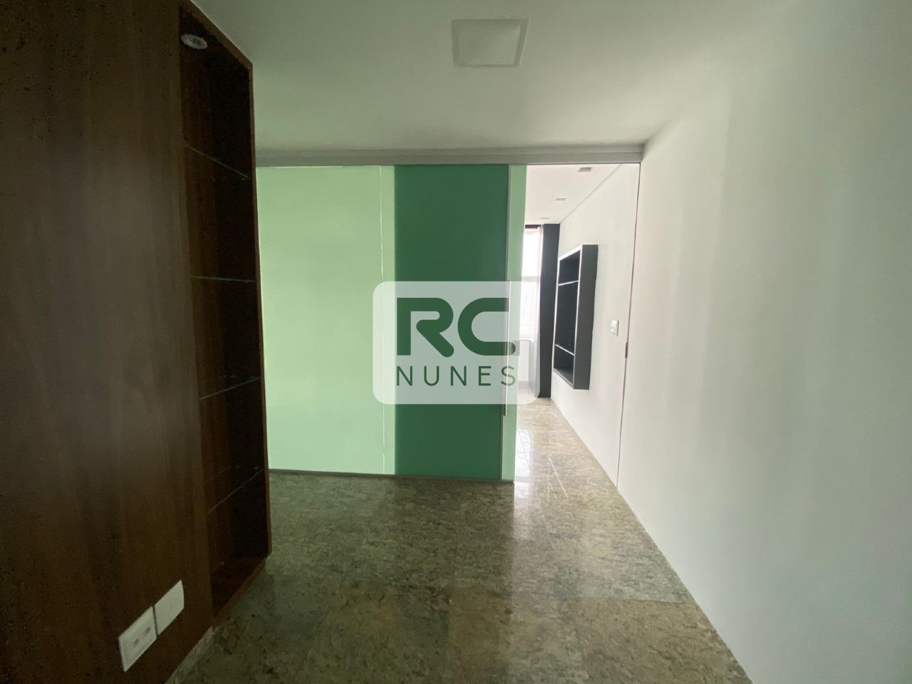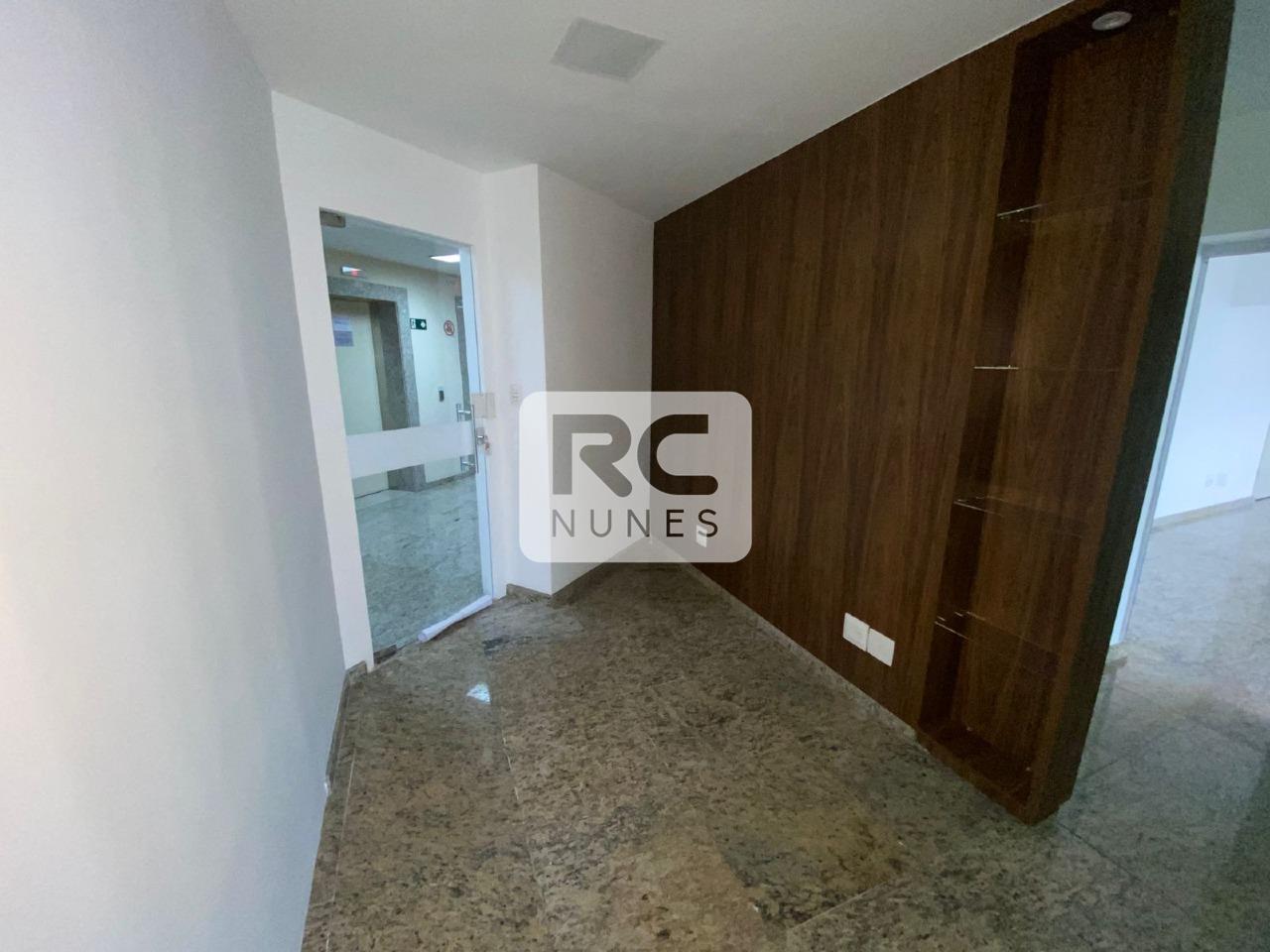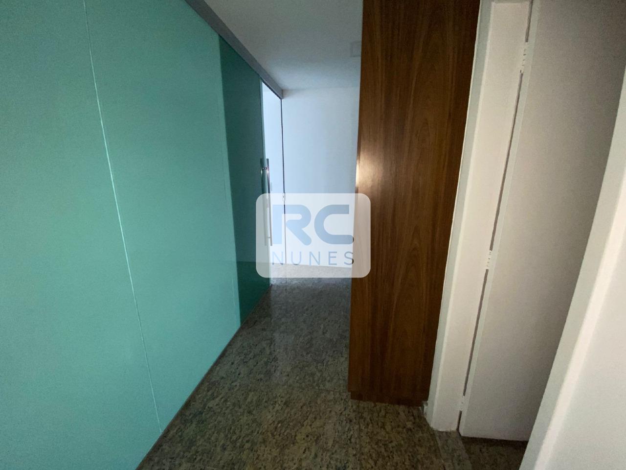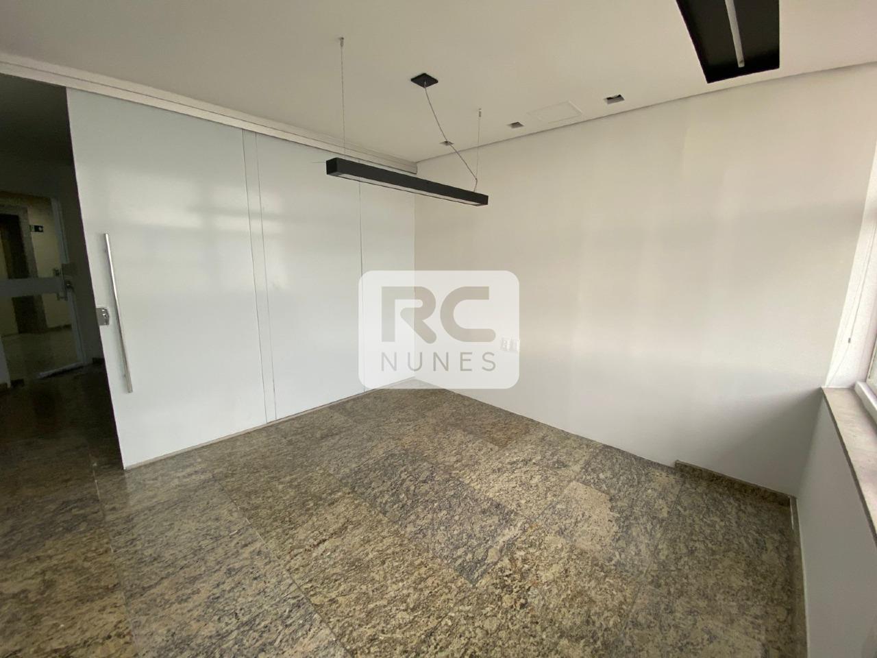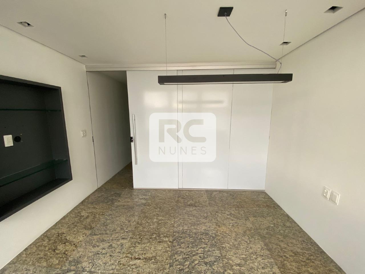 Sala com área total de 114m² com divisórias em drywall, piso em granito e rebaixamento em gesso com iluminação embutida;